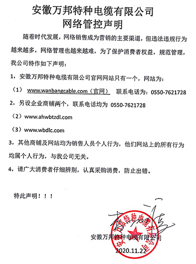 鄭重聲明:安徽萬邦特種電纜有限公司官方網站為:www_wanbangcable_com.cgtturf.cn,除此之外無任何子網站或合作網站,其余均為假冒偽劣。電話:0550-7621728 13485756353 地 址:安徽省天長市滁州高新技術產業開發區經四路29號